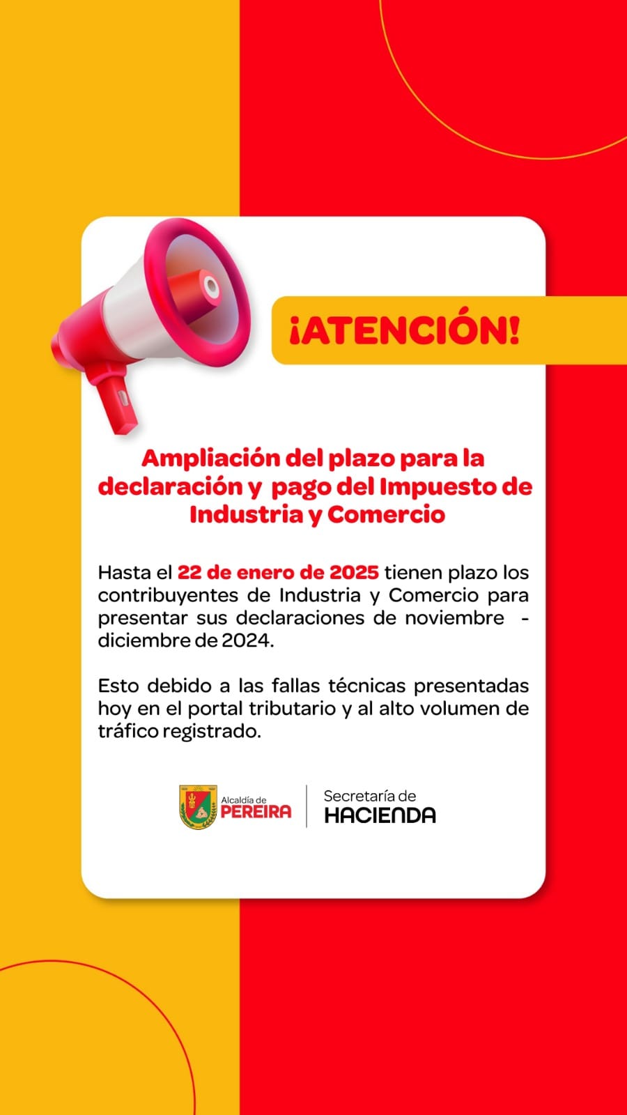 La Alcaldía de Pereira a través de la Secretaría de Hacienda, informa a los contribuyentes del municipio que debido a las fallas técnicas presentadas hoy en el portal tributario y al alto volumen de tráfico registrado, el proceso de declaración y pago del Impuesto de Industria y Comercio se ha visto afectado.