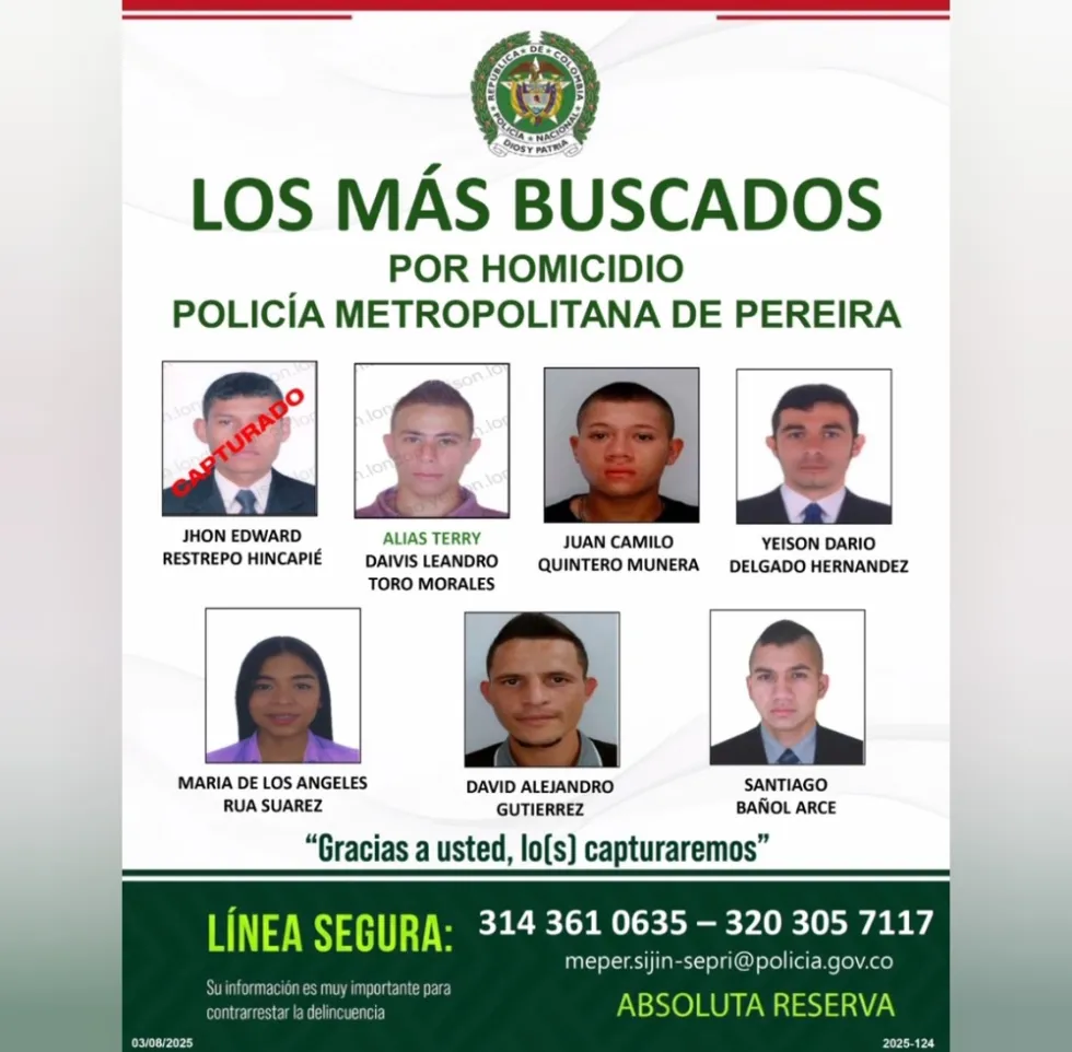 Entre los siete hay una mujer. Según la Policía, son objetivo prioritario entre Pereira y Dosquebradas.
