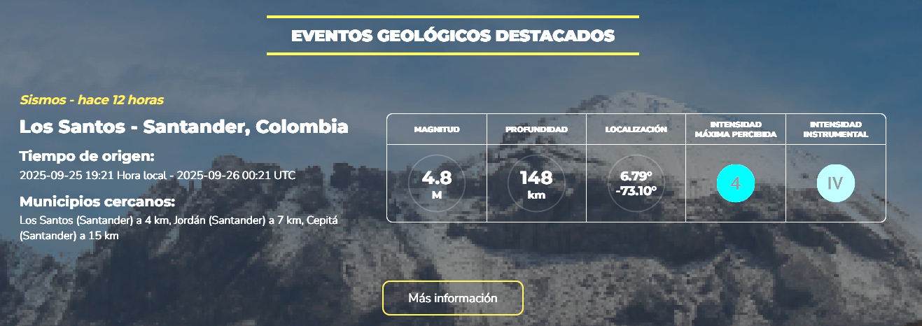 El Servicio Geológico Colombiano (SGC), que se encarga de monitorear la actividad sísmica del país, reportó un nuevo temblor en la noche de este jueves, 25 de septiembre.